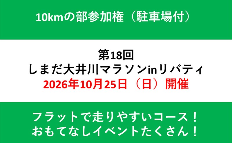 | 容量 | 【10km・駐車場付】第18回しまだ大井川マラソンinリバティ 10kmの部参加権 1名分 |