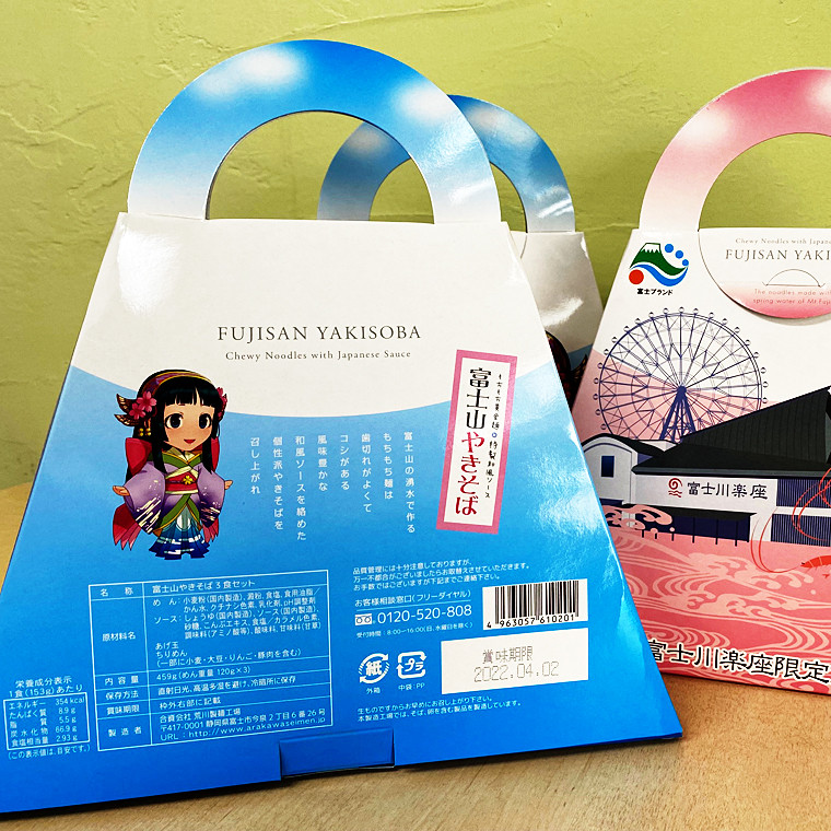 富士地区では昔から焼きそばも「蒸し麺」で食されてきました。 荒川製麺工場が富士山の湧水で作る黄金麺は、歯切れがいいのにもっちもち。 風味豊かな特性和風ソースを絡めて香ばしく炒めればクセになること間違いなし。 かわいい「荒川にふじ」ちゃんの特製富士山型の箱入りでお届けする揚げ玉・ちりめんトッピングのセット(写真下段)に、今回は道の駅「富士川楽座」とのコラボ商品「桜えび入り」(写真下段)をセットにしました。 やきそばの可能性を広げた個性派やきそばを是非ご賞味ください。