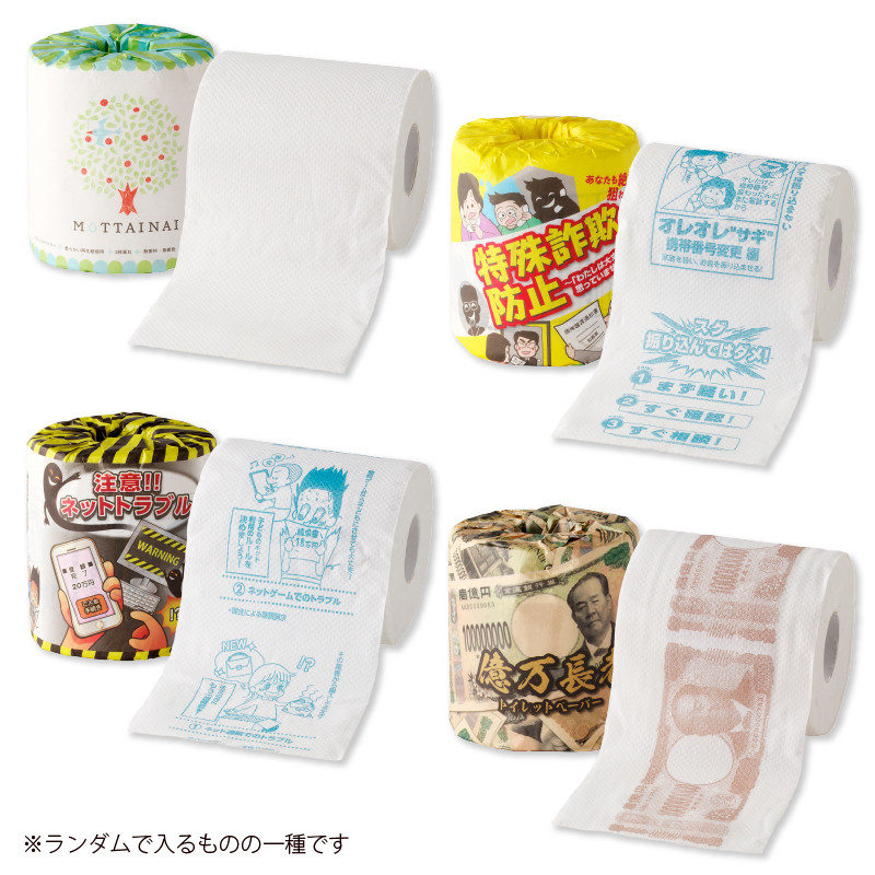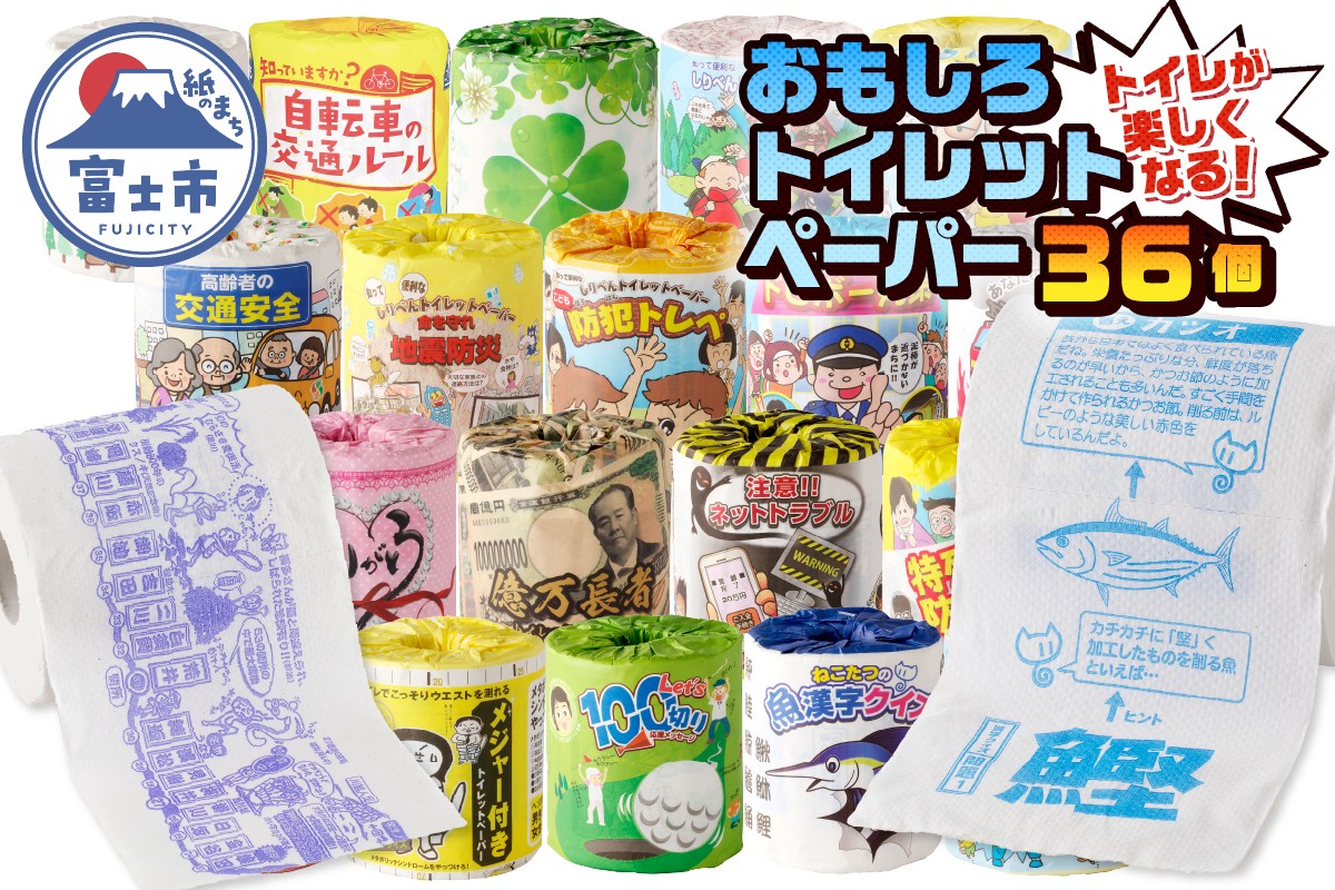 様々なイラストが印刷されたおもしろトイレットペーパー36個の詰め合わせです。