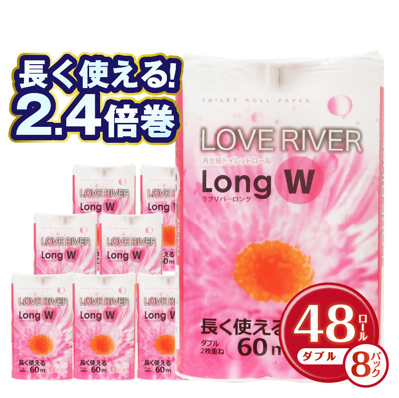 長く使える 2.4倍巻 トイレットペーパー 「ラブリバーロング」 ダブル 48ロール (6R×8パック) (1ロール 60m) 長巻き 115ロール相当 再生紙 無地 無色 備蓄 防災 消耗品 日用品 生活用品 富士市 [sf002-055]
