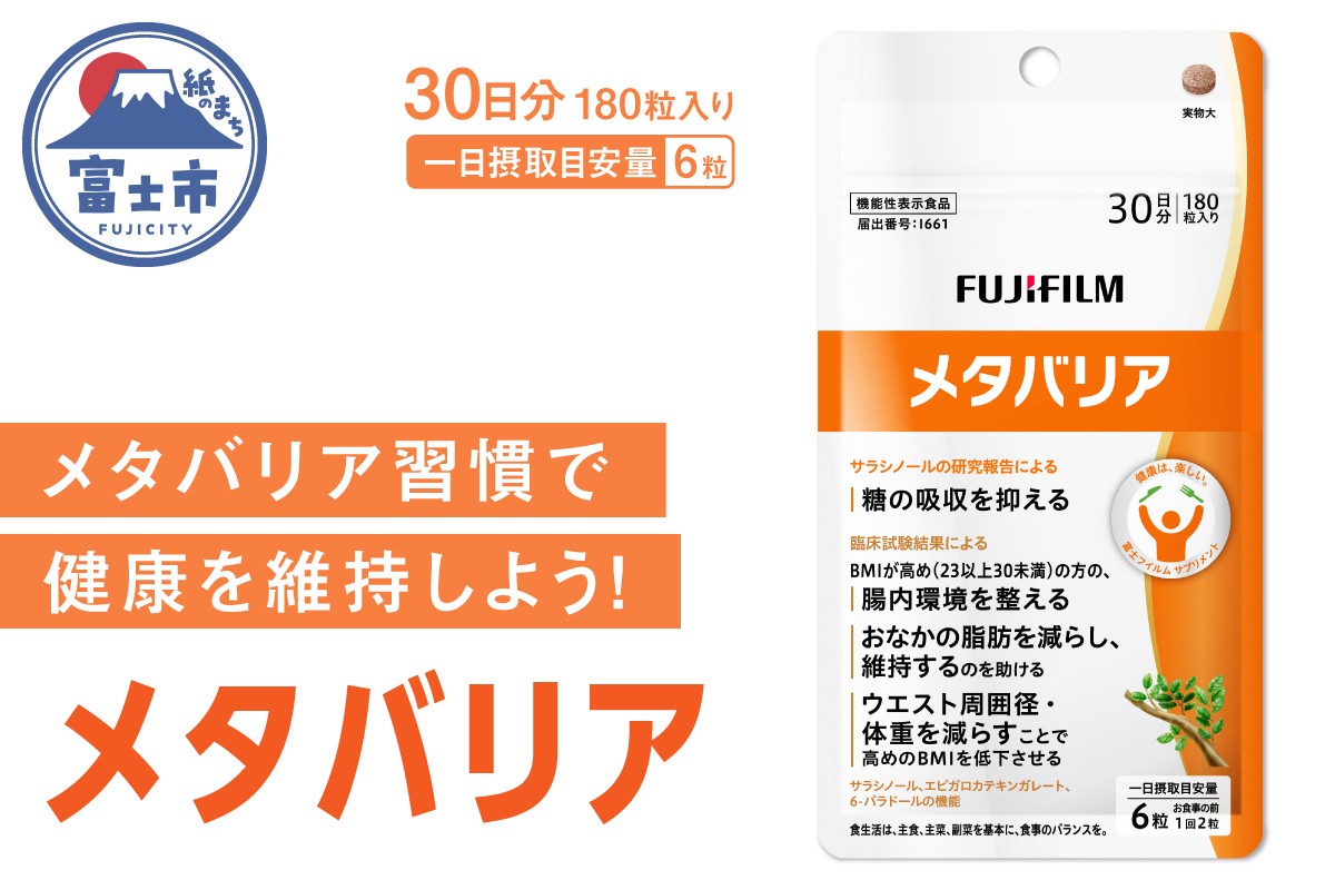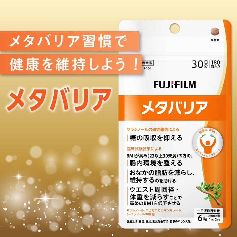 BMI高めの方の「おなかの脂肪を減らし、維持するのを助ける」「腸内環境を整える」 富士フイルム メタバリア 約30日分 (180粒) 1袋 FUJIFILM 袋タイプ サプリメント サラシア 腸内環境 糖質 腸活 脂肪 体重 健康食品 おなか BMI高め 健康管理 機能性表示食品 静岡県 富士市 [sf001-035]