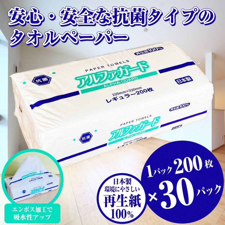 安心な日本製!エンボス加工で吸水性アップ!再生紙100% タオルペーパー 「アルファガード」 レギュラー 30パック (1パック 200枚) 安心 安全 抗菌 再生紙100% ハンドタオル ペーパータオル 新興加工 富士市 日用品(a1835)