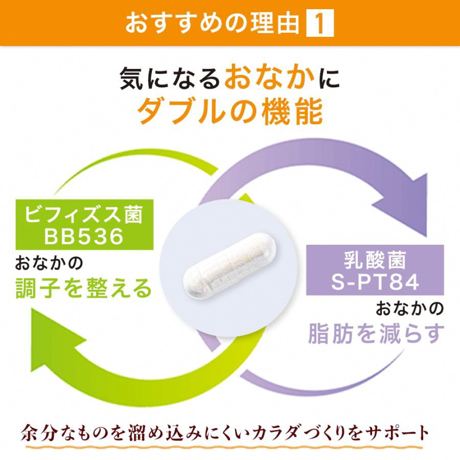 『ラクフィット』に配合された乳酸菌S-PT84がおなかの脂肪を減らし、ビフィズス菌BB536が腸内フローラを良好にすることでおなかの調子を整えます。