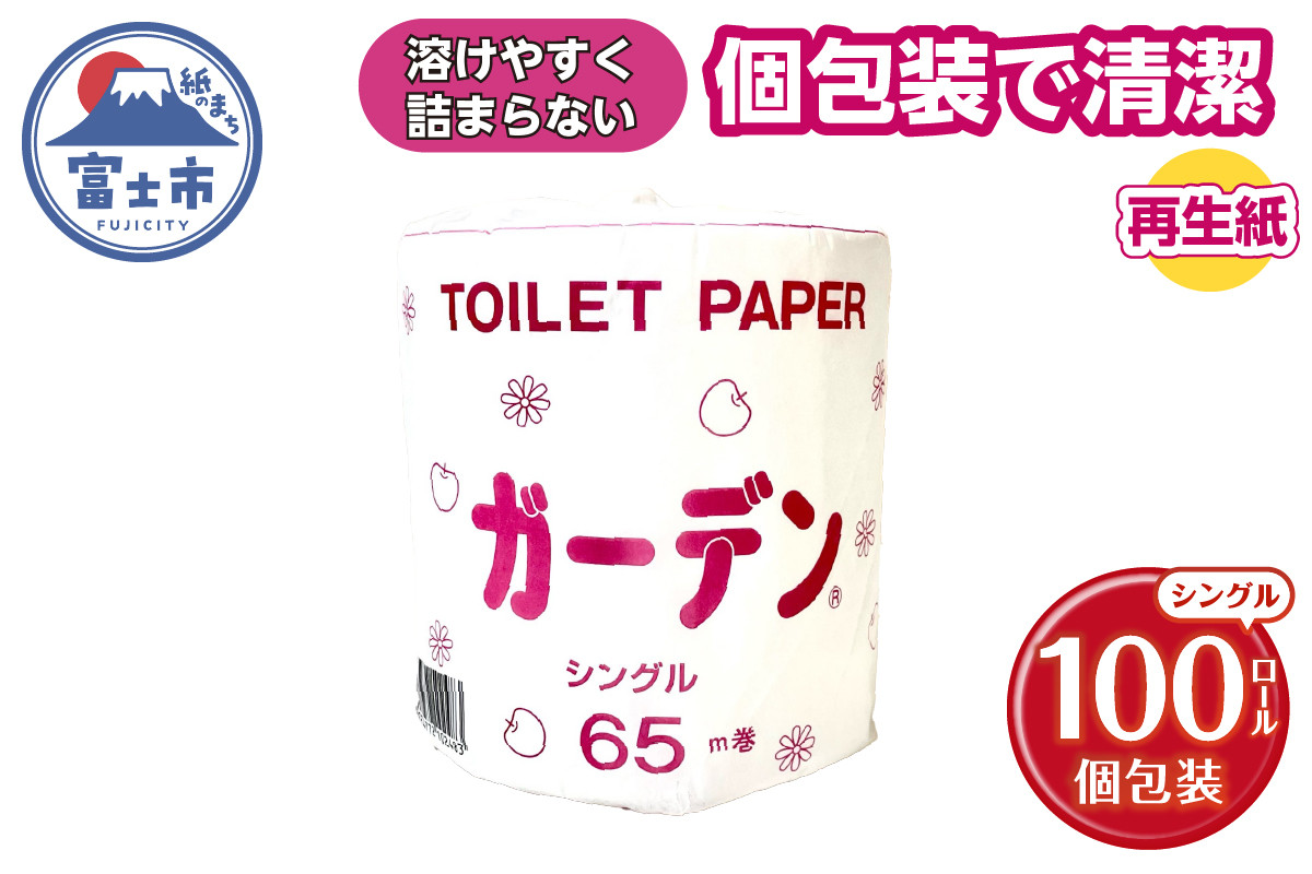 個包装で清潔 溶けやすく詰まらない 経済的で使いやすい トイレットペーパー ガーデン シングル 65m 100ロール 個包装 再生紙100% 防災 備蓄 日用品 消耗品 生活用品 富士市 [sf079-003]