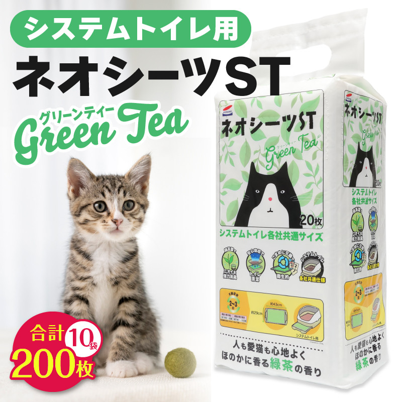 人も愛ネコも心地よくほのかに香る緑茶の香り システムトイレ用 ネオシーツST グリーンティー 計200枚 (20枚×計10袋) ペットシーツ 強力消臭 緑茶の香り 衛生的 ペットシート トイレ 猫 ペット 日用品 消耗品 備蓄 防災 静岡県 富士市 [sf002-308]