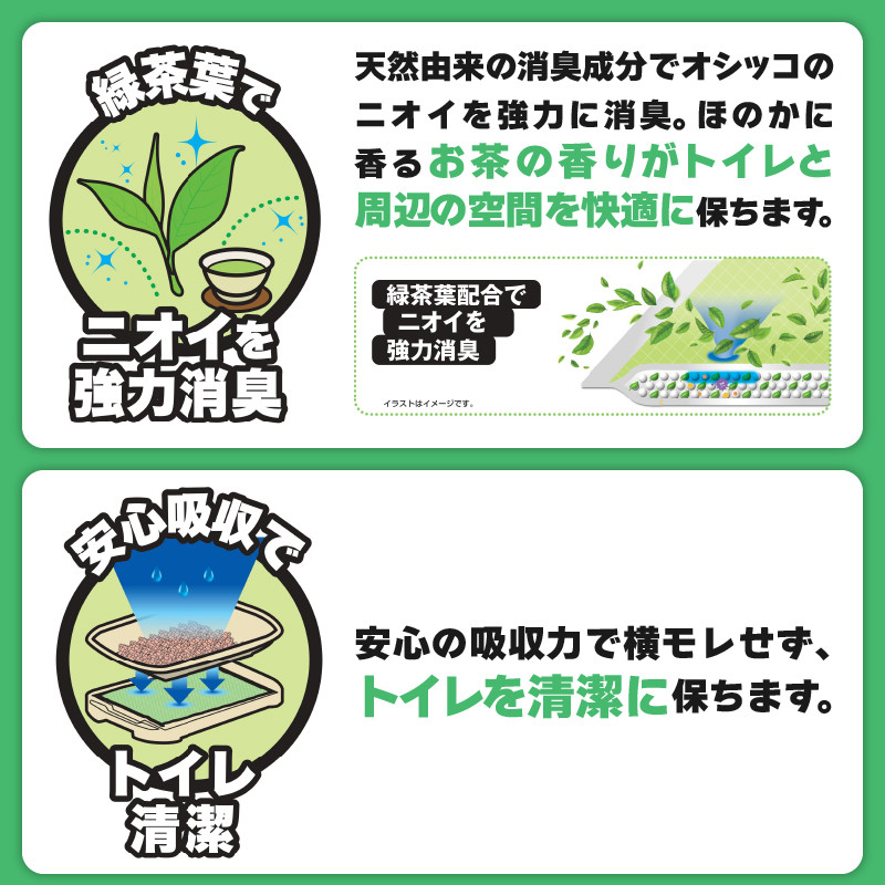 緑茶葉配合でニオイを強力消臭!天然由来の消臭成分でオシッコのニオイを強力に消臭。ほのかに薫お茶の香りがトイレと周辺の空間を快適に保ちます。