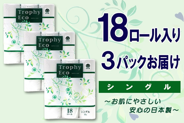厳選された原料のみを使用したトイレットペーパー トイレットペーパー シングル 54ロール (18個 × 3パック) トロフィーエコ ハーフロット 小分け 日用品 消耗品 備蓄 大容量 エコ 防災 生活雑貨 生活用品 柔らかい ペーパー 再生紙 富士市 [sf077-034]