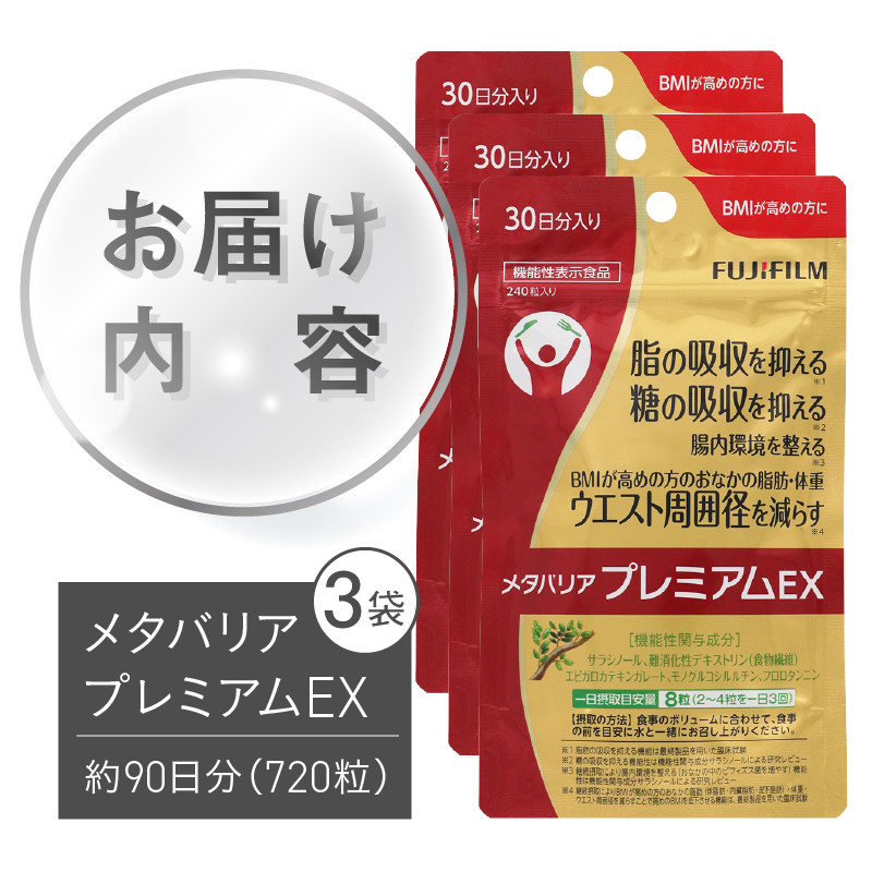 サプリ 富士フイルム メタバリアプレミアムEX 約30日分 (240粒) 3袋 FUJIFILM サプリメント サラシア 腸内環境 糖質 腸活 内臓脂肪 脂肪 健康食品 BMI 健康管理 ウエスト おなか 袋タイプ 機能性表示食品 富士市