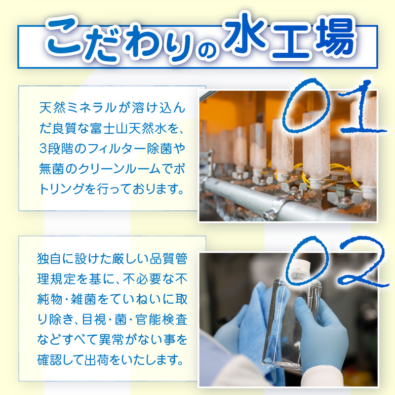 天然ミネラルが溶け込んだ良質な富士山天然水を、3段階のフィルター除菌や無菌のクリーンルームでボトリングを行っております。