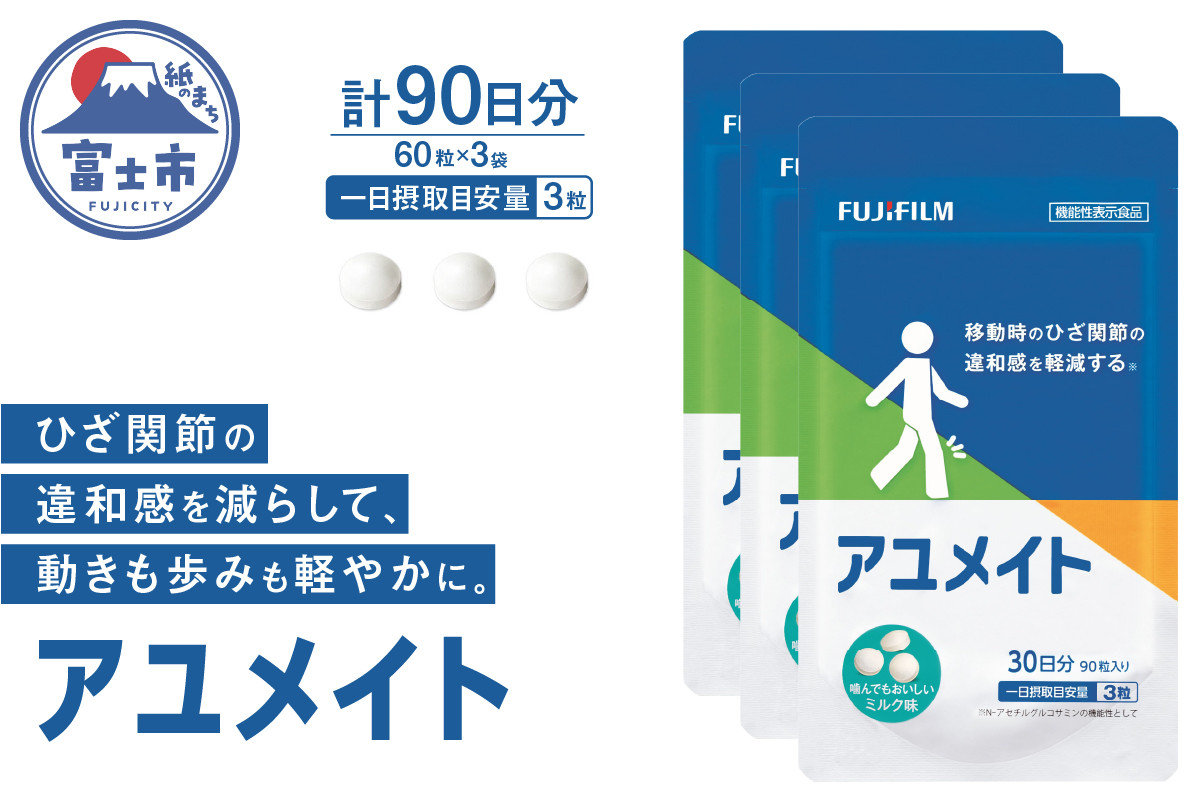 アユメイト 約30日分 (90粒) 3袋セット サプリメント ひざ関節 違和感 軽減 N-アセチルグルコサミン 噛んで食べられる ミルク味 歩行 階段の昇り降り 機能性表示食品 FUJIFILM 静岡県 富士市