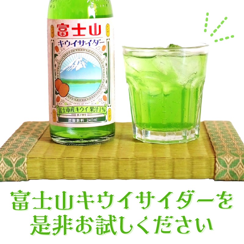 富士山麓で汲み上げられた「萬年水」に、富士市(旧富士川町)で収穫されたキウイを追熟により糖度を上げて丁寧に搾った果汁を加え、爽やかな香りとみずみずしい甘酸っぱさが調和し清涼感あふれる味わいのご当地サイダーです。
