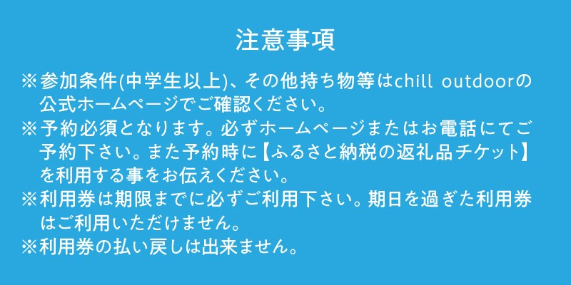 ※参加条件(中学生以上)、その他持ち物等はchill outdoorの公式ホームページでご確認ください。