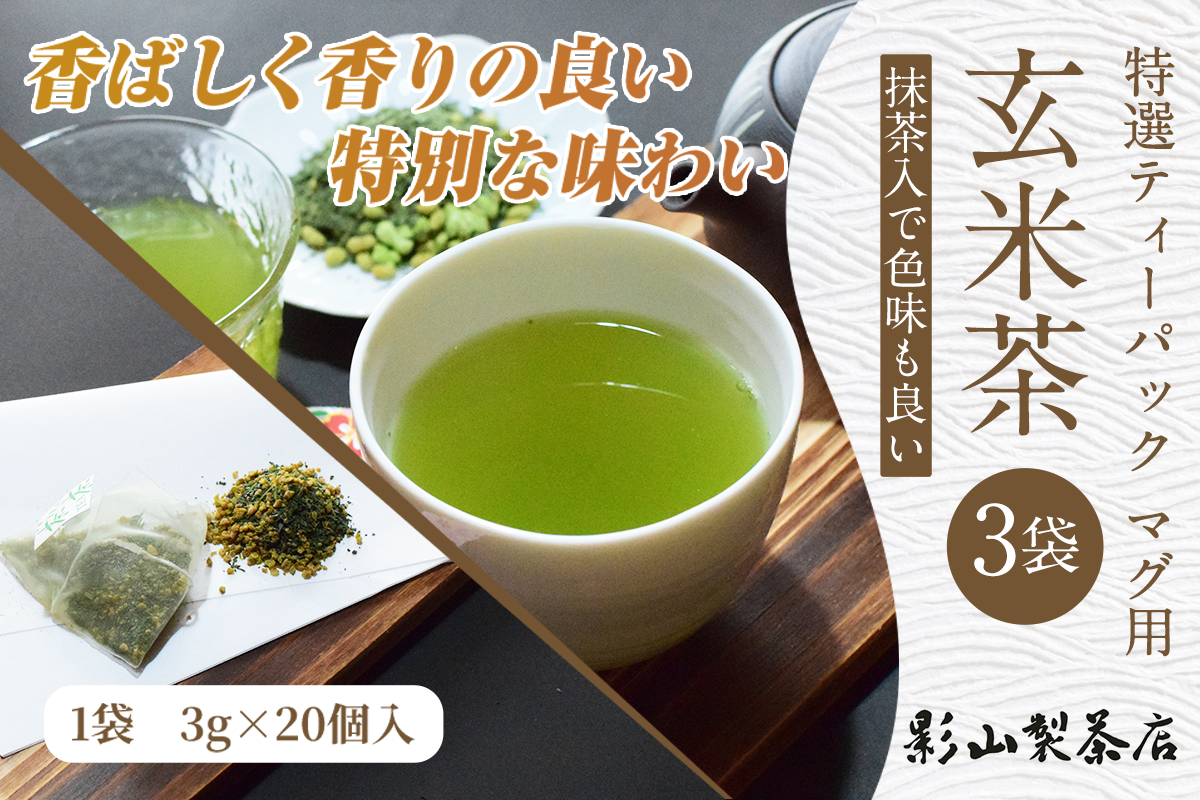 特選 ティーパック マグ用 抹茶入 玄米茶 3袋 (3g×20個入) 緑茶 玄米 抹茶 ティーバッグ 影山製茶店 お手軽 水出し ティータイム おもてなし リラックス 手土産 富士市