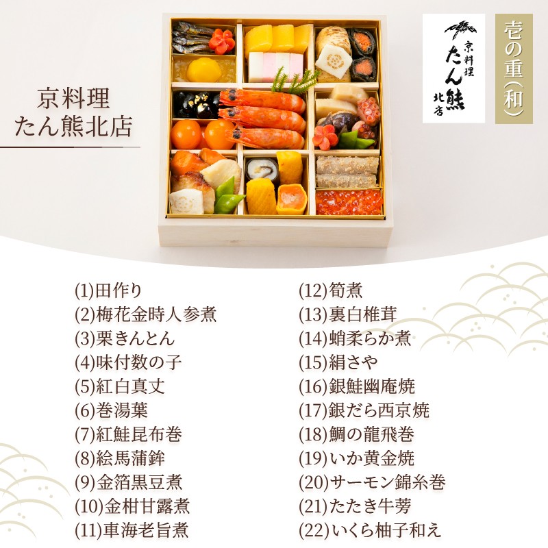 (1)田作り(2)梅花金時人参煮(3)栗きんとん(4)味付数の子(5)紅白真丈(6)巻湯葉(7)紅鮭昆布巻(8)絵馬蒲鉾(9)金箔黒豆煮(10)金柑甘露煮(11)車海老旨煮(12)筍煮(13)裏白椎茸(14)蛸柔らか煮(15)絹さや(16)銀鮭幽庵焼(17)銀だら西京焼(18)鯛の龍飛巻(19)いか黄金焼(20)サーモン錦糸巻(21)たたき牛蒡(22)いくら柚子和え