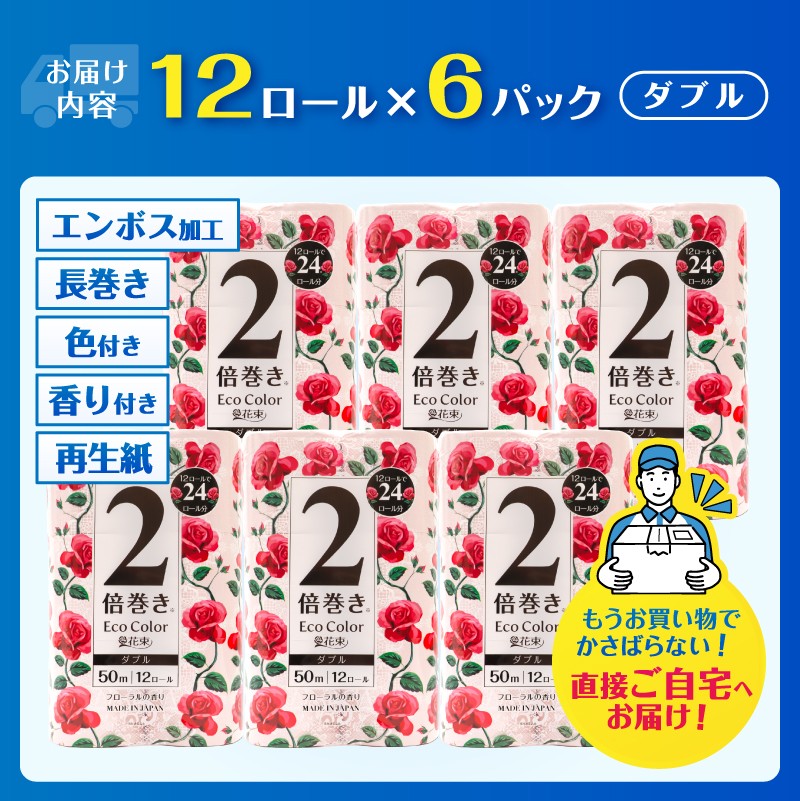 2倍巻き トイレットペーパー エコカラー花束 ピンク ダブル 72ロール (12R×6パック) ピンクカラー 再生紙100% リーフエンボス加工 長尺 日用品 日用雑貨 消耗品 備蓄 防災 静岡県 富士市