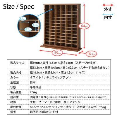 | 容量 | ■お礼品の内容について ・1/64サイズ対応 ミニカーディスプレイラック(ブラウン) MCD-78B[1台] 製造地:静岡県磐田市 ■原材料・成分 カラー:ブラウン 製品サイズ:幅59cm×奥行16.5cm×高さ64cm(ステージ台座含) 幅53.5cm×奥行10.5cm×高さ62.3cm(ステージ台座含まない) 製品内寸:幅48.1cm×奥行8.1cm×高さ4.3cm(1マス) 状態:半完成品 製品重量:7.5kg 耐荷重:固定棚 0.2kg※縦仕切りを取り外して2マス分のスペースを使った場合まで 材質 主材:プリント紙化粧版 扉:アクリル 備考:転倒防止補助バンド付 |