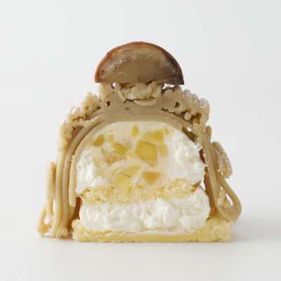 モンブランには栗の葉をあしらっており、木の枝に実る栗を彷彿とさせる趣深いデザインとなっております。視覚でも和の情緒をお楽しみいただける逸品です。