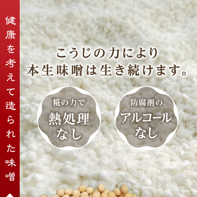 【説明】活きた糀の力で免疫力アップして下さい!!老舗こうじ屋の木おけ仕込み。北海道産丸大豆、国産米を使用し、職人が造り上げた一品です。米糀の粒を残したお味噌です。糀をすり込んだ白味噌を長期熟成させたコクと旨みのある熟成味噌です。(要冷蔵)