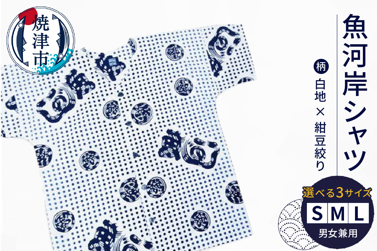 焼津魚河岸組合のラベルと「認定証」付 a17-077 夏 涼 祭り 魚がし シャツ S・M・L 白地×紺豆絞り