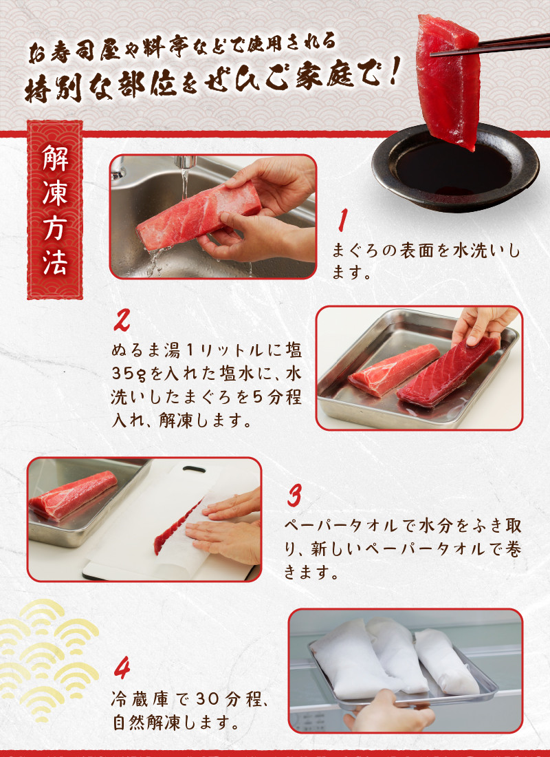 | 容量 | 天然南まぐろ「天身」(赤身柵): 約700g |