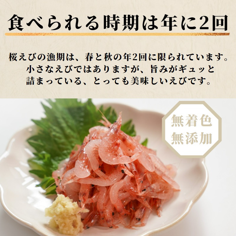 【説明】産地直送 駿河湾桜えび 静岡県産の貴重なサクラエビになります。獲れたて新鮮なまま急速冷凍していますので、鮮度は抜群。生食お刺身で良し!かき揚げ天ぷら・炊き込みご飯にも相性抜群です。是非お召し上がりください!