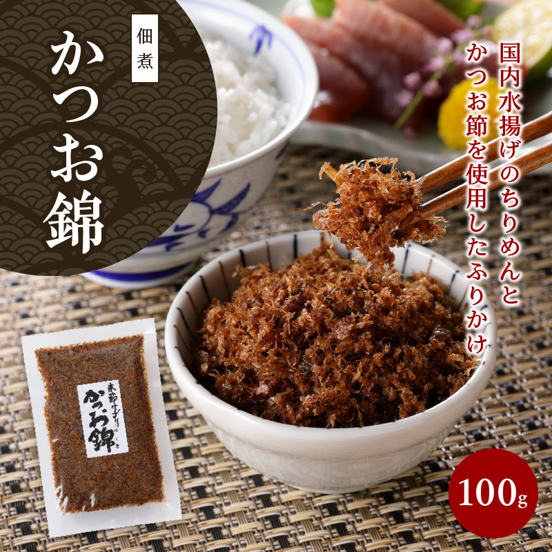 【説明】【まぐろ尾肉やわらか煮】一尾のまぐろからわずかしか取れない尾肉を一口大にカットし、砂糖・醤油で炊きあげました。やわらかさが特徴です!【かつお錦】国内水揚げのちりめんとかつお節を使用したふりかけです。旅館でも使用されています。株式会社山勝さまご提供。