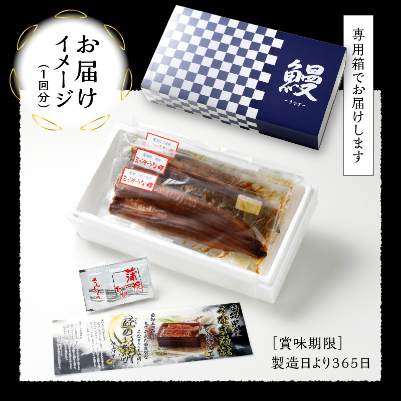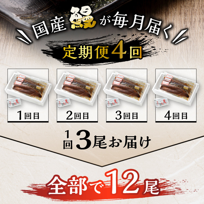 【説明】厳選された国産うなぎ(三河産)の長焼きを3尾ずつ4回の定期便にてお届け致します。真空パックのまま湯煎にて解凍後、トースター等で再加熱いたしますと皮目がパリッとし、大変美味しく召し上がれます。1尾で2名様が召し上がれる大きさです。