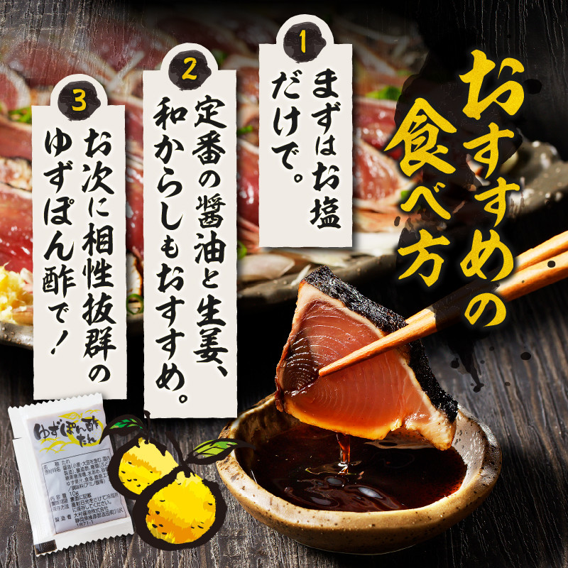 【ゆずぽん酢たれ】藁焼きの香りとカツオの味と相性の良いタレを求めて十数種類を味見。手間でも火入れして作るゆずぽん酢を選びました。