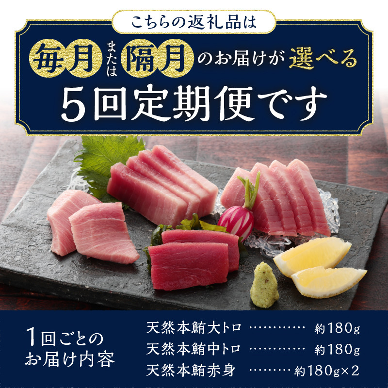 【説明】天然本まぐろの独自の深みを堪能できるセットを5回に分けて毎月/5回に分けて2か月に1回(隔月)お届けします。解凍方法の紙を同梱します。