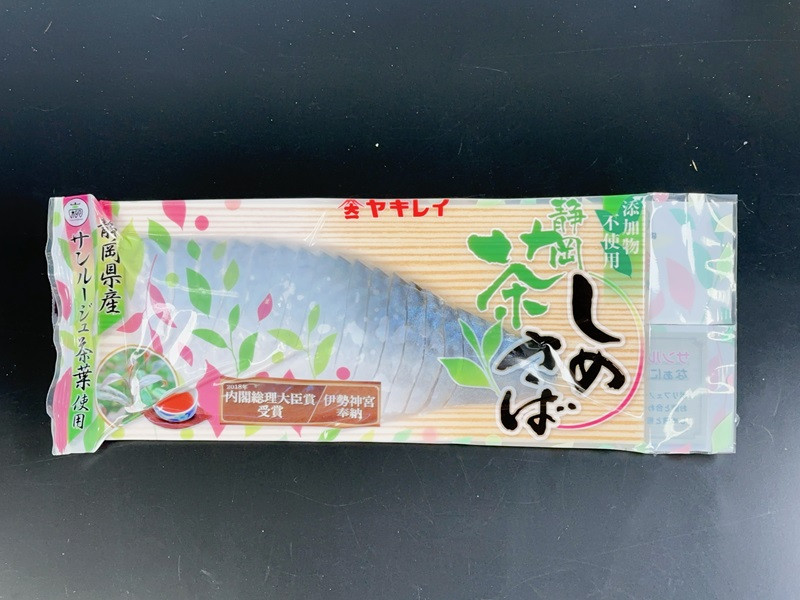 静岡茶しめさば:国産真鯖に塩・砂糖・リンゴ酢・サンルージュ茶を使用しています。茶は下処理使用の為味や香りはしませんが青臭さを押さえカテキン効果で無添加となっています。しょっぱさと酸味を和らげ優しい味で鯖本来の味を楽しめます。