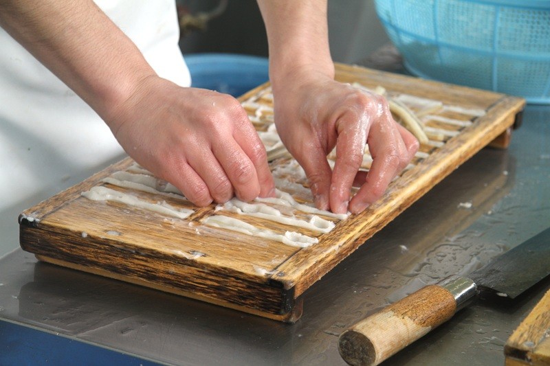 自然な弾力と優しいながらもしっかりとした味わいが特徴です。どの製品も食品添加物無添加で仕上げています。そのまま食べていただいても美味しいですし、少しあぶっていただいても香ばしくなります。当店1番人気のごぼう巻は木型による手作りで60年以上のロングセラーです。