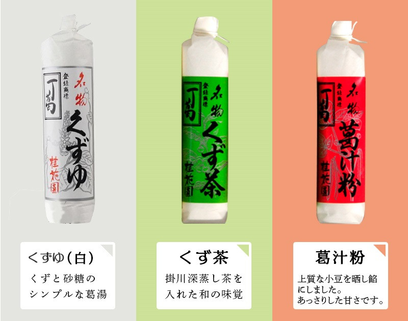 歴史と伝統の町、掛川特産の「くずゆ」 昭和初期より独自の製法で風味と味にこだわり続けた銘菓です。 くずゆの味は3種。 くずゆ、くず茶、葛汁粉。 是非、お楽しみください。