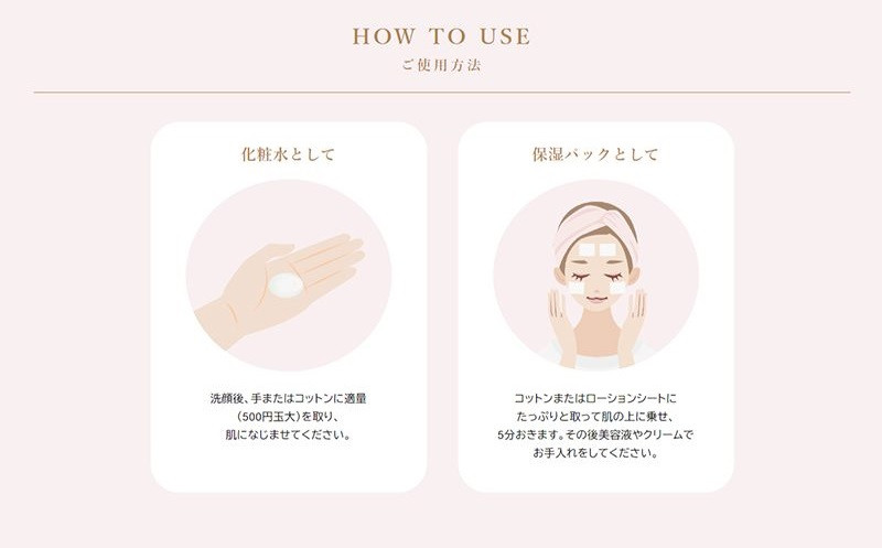 洗顔のあと、コットンや手のひらに適量をとり、お顔に優しくなじませます。
