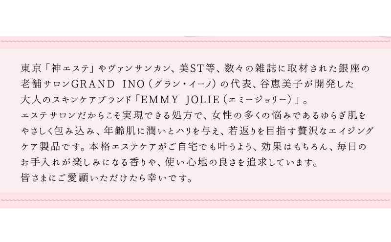 サロンの雑誌掲載多数・美容機器監修も手掛けるグラン・イーノの代表兼美容家、谷恵美子のプロデュースにより生まれた、大人の女性の為のスキンケアブランド。谷恵美子の“エミ“とフランス語で内面的な美しさを意味する”ジョリー“をかけ合わせたブランド名であり、代表自らが今までエステティックサロンのお客様の肌悩みを解決することと同時に、自分自身の肌を生きいき保ちつつ年齢肌にストップをかける為に商品化をスタートしました。女性のゆらぎ肌を優しくいたわりつつ、エステティックサロン同様のエイジングケアがご自宅でも叶うように、有効成分の配合率を極限まで高め、効果をとことん追求しております。