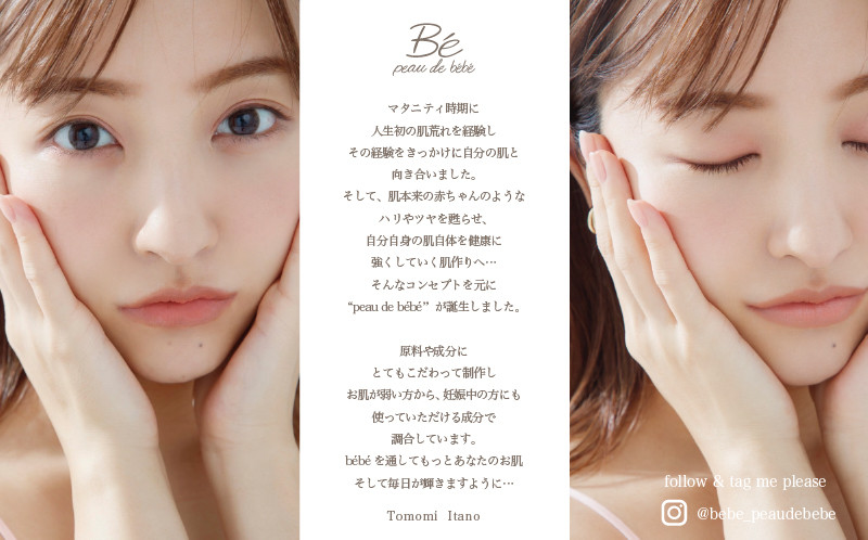 安心、安全、信じられる化粧品には、水が絶対的な存在になります。 直接肌につけるものだからこそ、きれいな水を使用したいと言う思いから、 全国にある、多くの化粧品工場に相談しました。そこで私が出会ったのが、 化粧品製造工場が多くある、掛川の水でした。 製造工場では、ひとつひとつ丁寧に充填、包装を行っている工場です。 【使用方法】 1.化粧水がしっかり浸透してから、1円玉硬貨から10円玉硬貨くらいの大きさを手にとり、両手に広げた後、顔の中心から外側に向かって大きく円を描くように伸ばしていきます。 2.広い範囲の額、あごの順番に伸ばしていきます。 ■注意事項/その他 【使用上の注意】 ◇こすりすぎや強いパッティングはお肌への刺激になるのでお控えください。 ◇傷やはれもの、湿疹等異常のあるところにはお使いにならないでください。 ◇お肌に異常が生じていないかよく注意してご使用ください。化粧品がお肌に合わないときは使用を中止してください。 (1)使用中、赤み、はれ、かゆみ、刺激、色抜け(白斑等)や黒ずみ等の異常が現れた場合。 (2)使用したお肌に直射日光があたり上記のような異常があらわれた場合。 ◇そのまま使用を続けますと症状を悪化させることがありますので、皮フ科医にご相談されることをお勧めいたします。◇目に入らないように注意し、入ったときはすぐ充分に洗い流してください。 ◇ご使用後はノズルの口もとをきれいに拭き、キャップをきちんと閉めてください。◇火気にご注意ください。冷蔵庫に保管してください。 peau de bebe 監修:板野友美