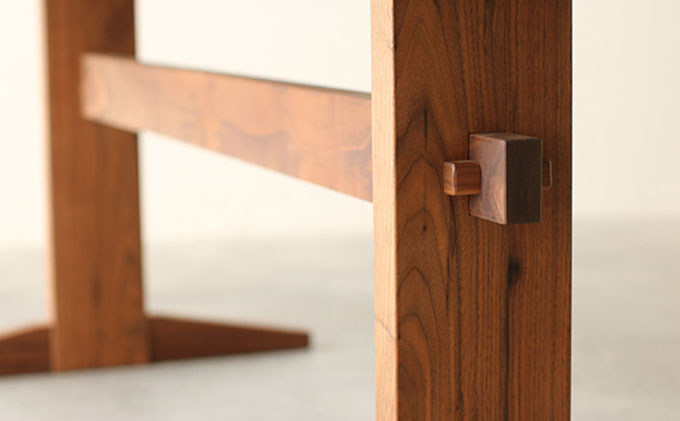 贅沢な無垢材の重厚感と品格のあるウォールナット材のダイニングテーブル。材質だけでなく、楔を使うなど和洋どちらにも合うデザインです。