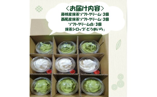 容量 | 藤枝産抹茶ソフトクリーム、西尾産抹茶ソフトクリーム、ソフトクリーム白:各3個(合計9個) 内容量:165g×9個 藤枝の抹茶シロップ「どうまいら」 |