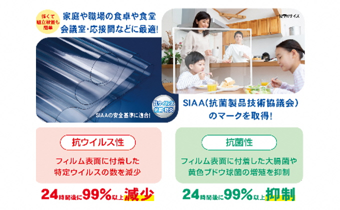 一般的なアクリル製に比べ軽量で持ち運びが簡単。一台あれば食事の際は食卓、来訪者が来た際は応接間などに移動して使用可能。使わないときは家具の隙間などに簡単に収納が出来ます。多機能PVCフィルムは防炎・抗ウイルス・抗菌性に優れています。軽量なため、小さなお子様のいる家庭でも安心して使用することができます。