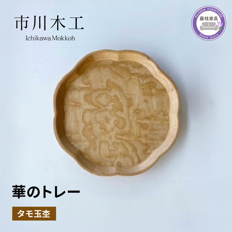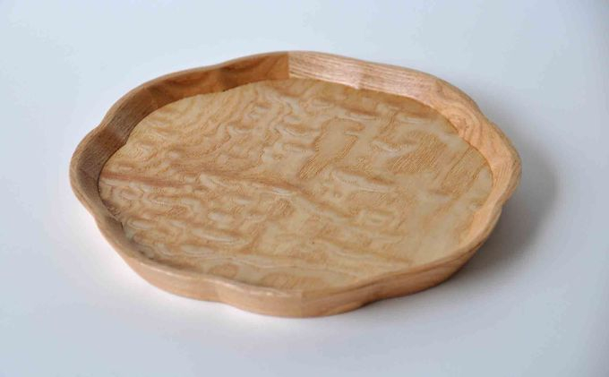 タモの輝く玉杢突板。縁もタモ無垢を使用した輪花型の小ぶりなトレー 木製 トレー お盆 無垢材 天然 素材 タモ 玉杢 トレイ テーブル コーディネート 飾り台 フラワーベース キッチン ランチョン マット 市川木工 華 藤枝家具 木材 木工 おしゃれ 家具 雑貨 インテリア 日用品 静岡県 藤枝市