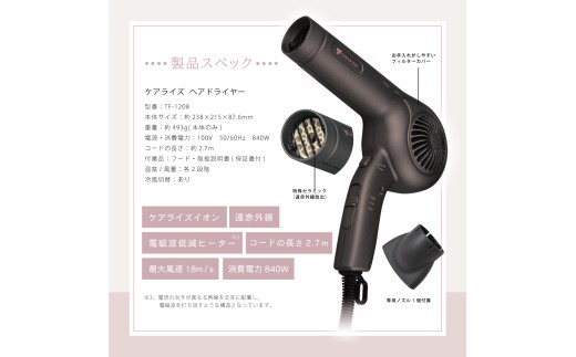 遠赤外線とケアライズイオンを放出しドライ後の髪が頭皮から健やかに ドライヤー ケアライズ イオン TF-1208 マット グレー家電 美容家電 スタイリング ヘアアレンジ プレゼント ギフト ヘアードライヤー 静岡県 藤枝市