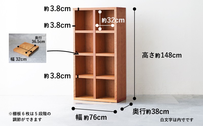 | 容量 | 商品名:オープンラック CBS-189-BC サイズ:W76×D38×H148cm 可動棚15段階 数量:1 生産地:静岡県藤枝市 素材:天板・側板・棚板:ブラックチェリー突板材 塗装:オイル仕上げ |