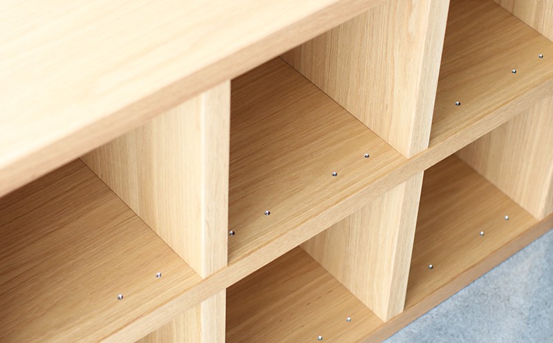 棚板1枚につき6cmピッチで5段階の調整ができます。棚板は3.8cmと厚みがあり、ダボの上ではなくスライドして差し込むので強度が保たれるとともに、棚板の移動がしやすいです。