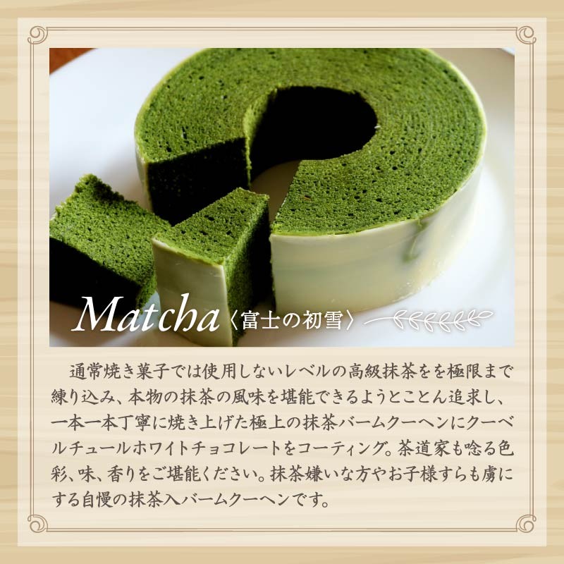 主原料となる卵には静岡県朝霧高原のブランド卵「宝山」のみ使用しています。芳醇な発酵バターの香りと、今まで味わったことのない食感が大人気の逸品です。「富士の初雪」は、静岡県産の高級抹茶を極限まで練り込み着色料を使用せず綺麗な深緑色のバームクーヘンに仕上げています。クーベルチュールホワイトチョコとの抜群の相性をお楽しみください。