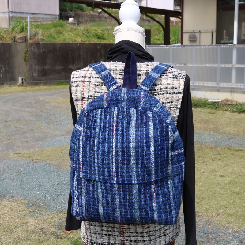 (関連キーワード: 裂き織り 裂き織り工房 藍染め バック リュックサック カバン かばん ポケット 着物 糸 経糸 緯糸 ファッション コーデ コーディネート ポイント 1点もの オンリーワン ハンドメイド )