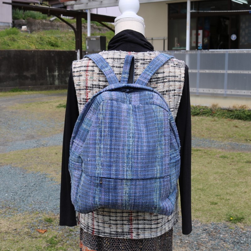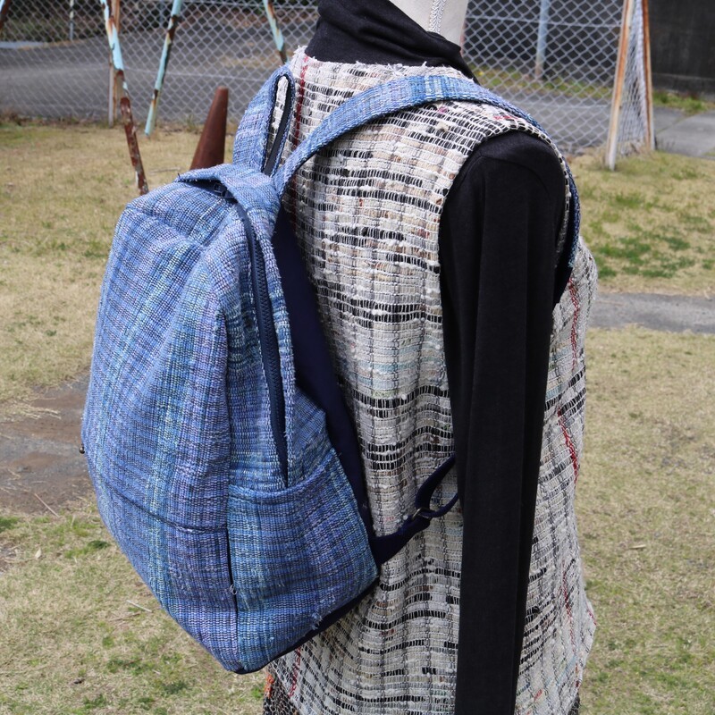 (関連キーワード: 裂き織り 裂き織り工房 青 バック リュックサック カバン かばん ポケット 着物 糸 経糸 緯糸 ファッション コーデ コーディネート ポイント 1点もの オンリーワン ハンドメイド )