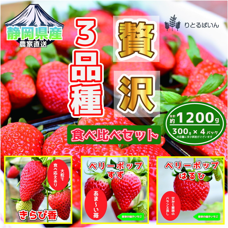 静岡県産 農家直送 いちご 贅沢 3品種食べ比べセット きらぴ香・ベリーポップすず、ベリーポップはるひ(3種4個セット) ※北海道、沖縄、離島への配送不可 ※2025年2月上旬~3月上旬頃に順次発送予定