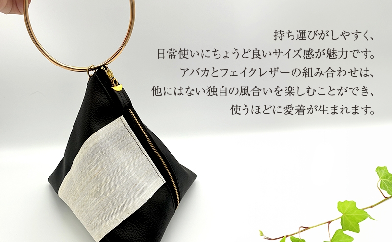 持ち運びがしやすく、日常使いにちょうど良いサイズ感が魅力です。アバカとフェイクレザーを組み合わせたこのバッグは、他にはない独自の風合いを楽しむことができ、使うほどに愛着が生まれます。