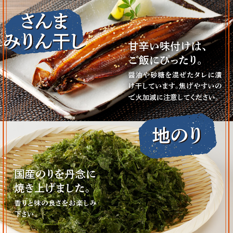 さんまとさばのみりん干しは、醤油や砂糖を混ぜたタレに漬け干しています。焼くときには焦げやすいので火加減に注意してください。甘辛い味付けは、ご飯にぴったりです。