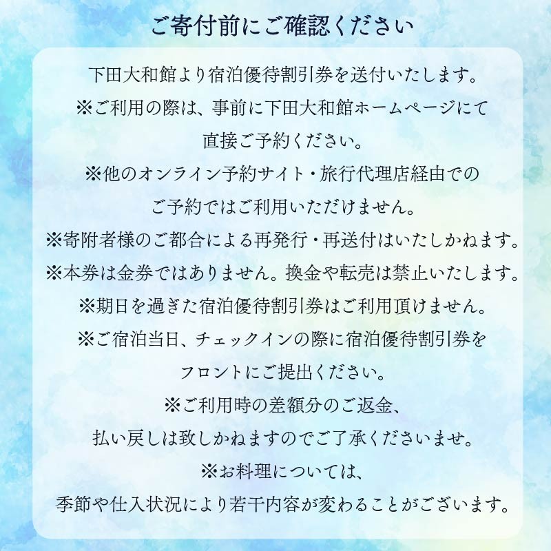※寄付お申し込み受付後、株式会社下田大和館よりチケット宿泊優待割引券を送付いたします。ご到着後すぐに内容物を確認いただきますようお願いいたします。