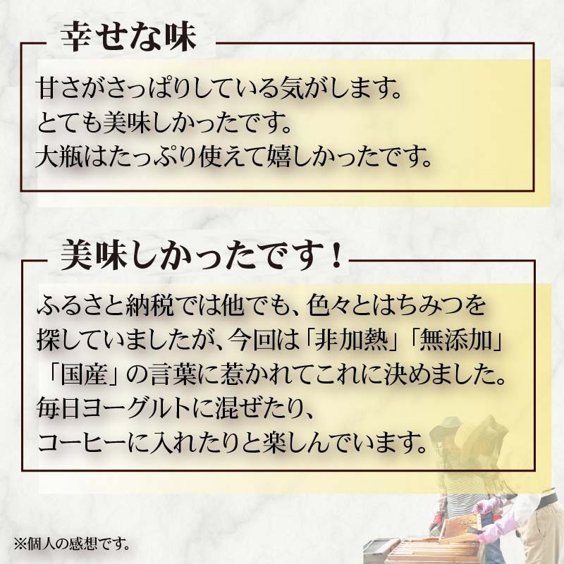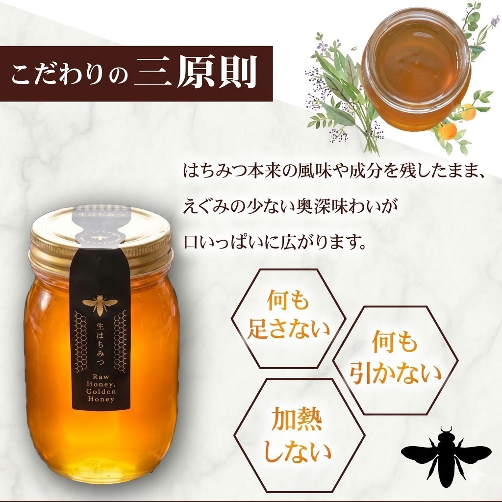 はちみつ本来の風味や成分を残したまま、えぐみの少ない奥深い味わいが口いっぱいに広がります。